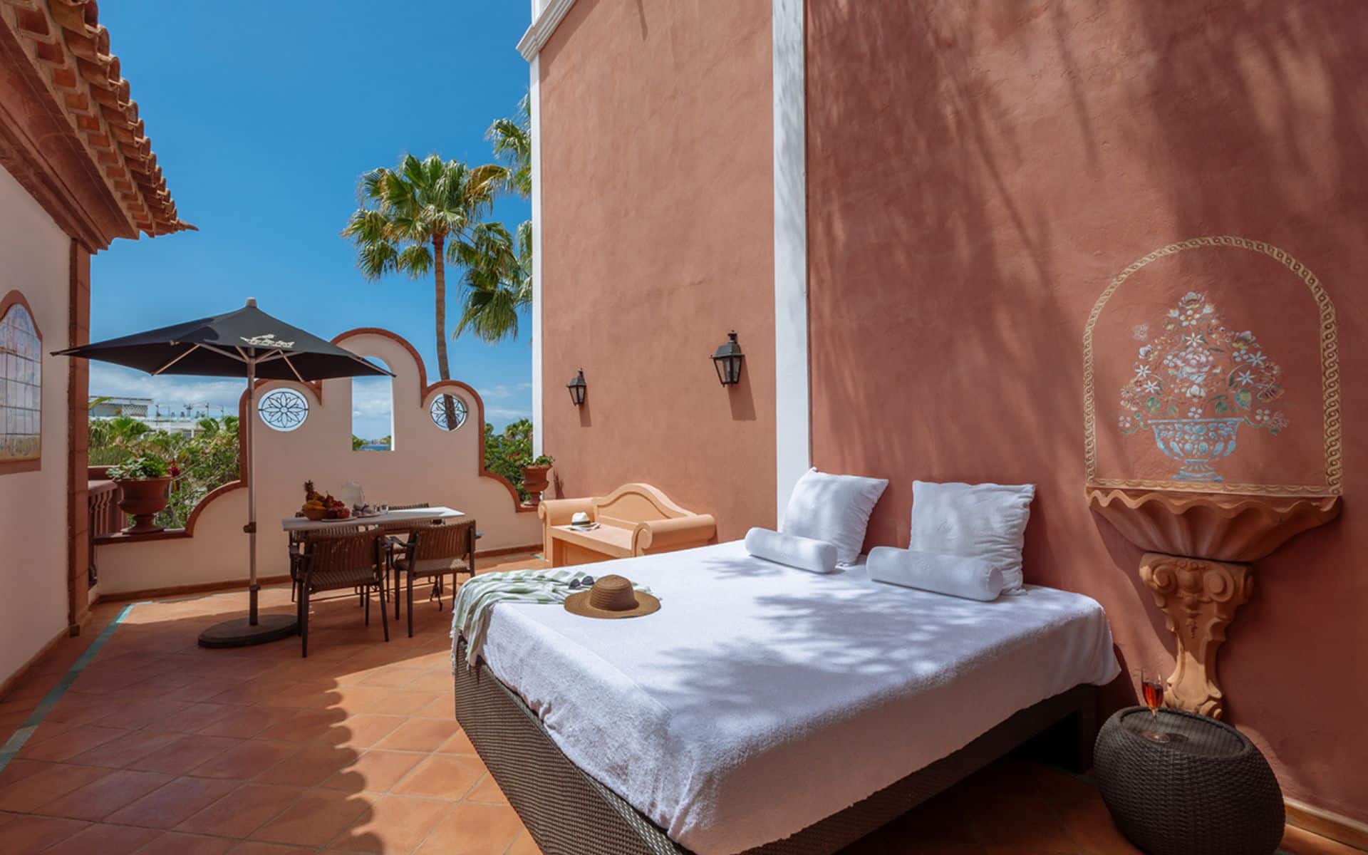 The magnificent Villa Las Retamas is spread over two floors and features one bedroom on the top floor with a huge en-suite bathroom with spectacular bathtub. The lounge, on the floor below, is bright and airy and leads on to the solarium terrace with dining area and private heated infinity pool. Villa Las Retamas is 256-square-metres with a 86-square-metre terrace. The villas enjoy an independent entrance and reception, reserved parking, flexible check-in and check-out times, 24-hour butler service, an exclusive Las Villas lounge, an exclusive pool and solarium, and an exclusive breakfast room and terrace. Complimentary water and soft drinks can be enjoyed in your villa, whilst high tea and Champagne is served daily. Amenities include: complimentary WiFi, air-conditioning, Nespresso machine, TV, Acqua di Parma bath products, beach Tote bag, sheet and pillow menu and minibar.