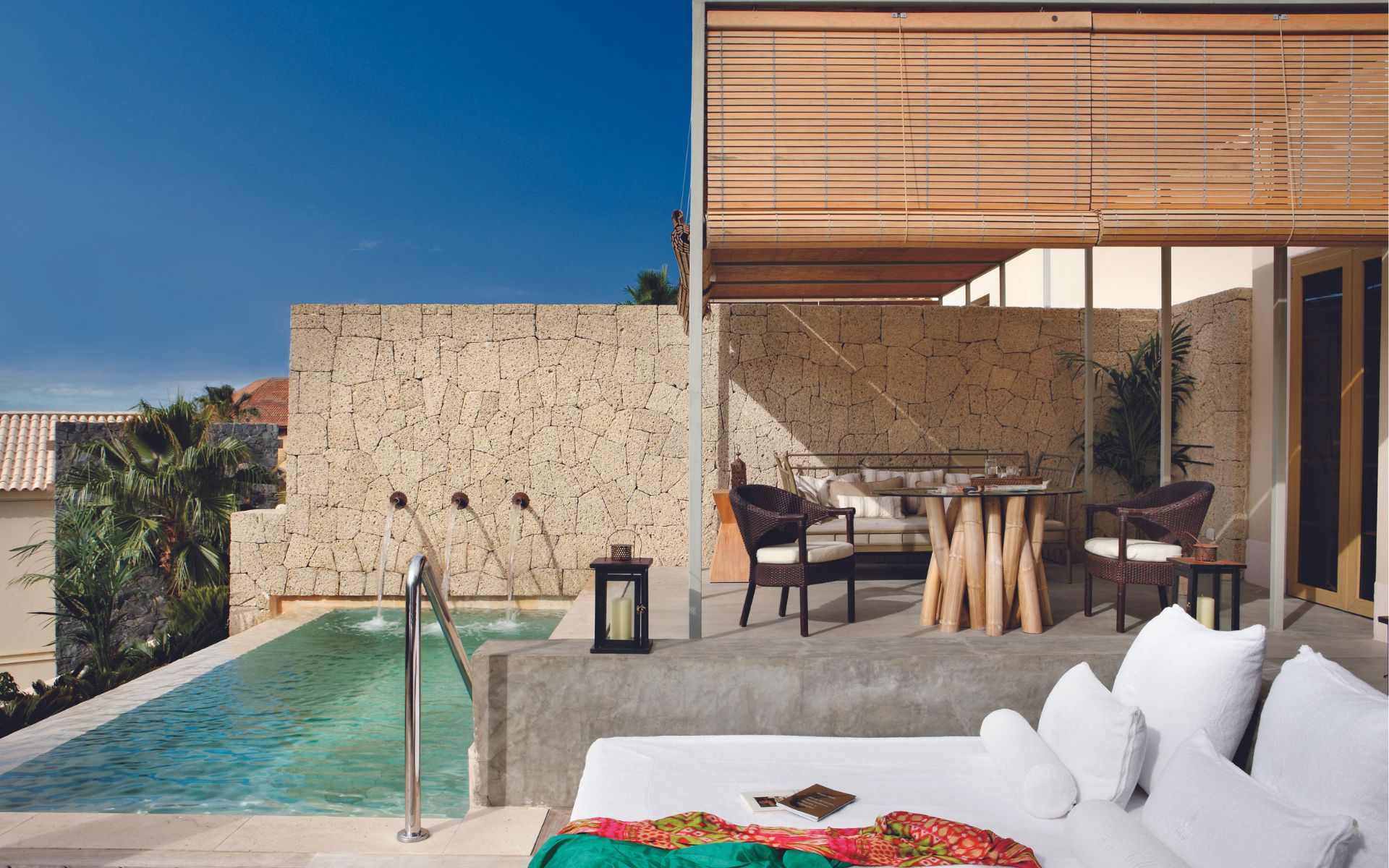 This one-bedroom villa features a stunning bedroom with four-poster bed with direct access to the private solarium. The bathroom has a basalt stone bathtub with a skylight and a range of aromatherapy products to choose from. Outside is a private heated infinity pool and dining area. Villa Las Palmeras is 202-square-metres with a 99-square-metre terrace. The villas enjoy an independent entrance and reception, reserved parking, flexible check-in and check-out times, 24-hour butler service, an exclusive Las Villas lounge, an exclusive pool and solarium, and an exclusive breakfast room and terrace. Complimentary water and soft drinks can be enjoyed in your villa, whilst high tea and Champagne is served daily. Amenities include: complimentary WiFi, air-conditioning, Nespresso machine, TV, Acqua di Parma bath products, beach Tote bag, sheet and pillow menu and minibar.