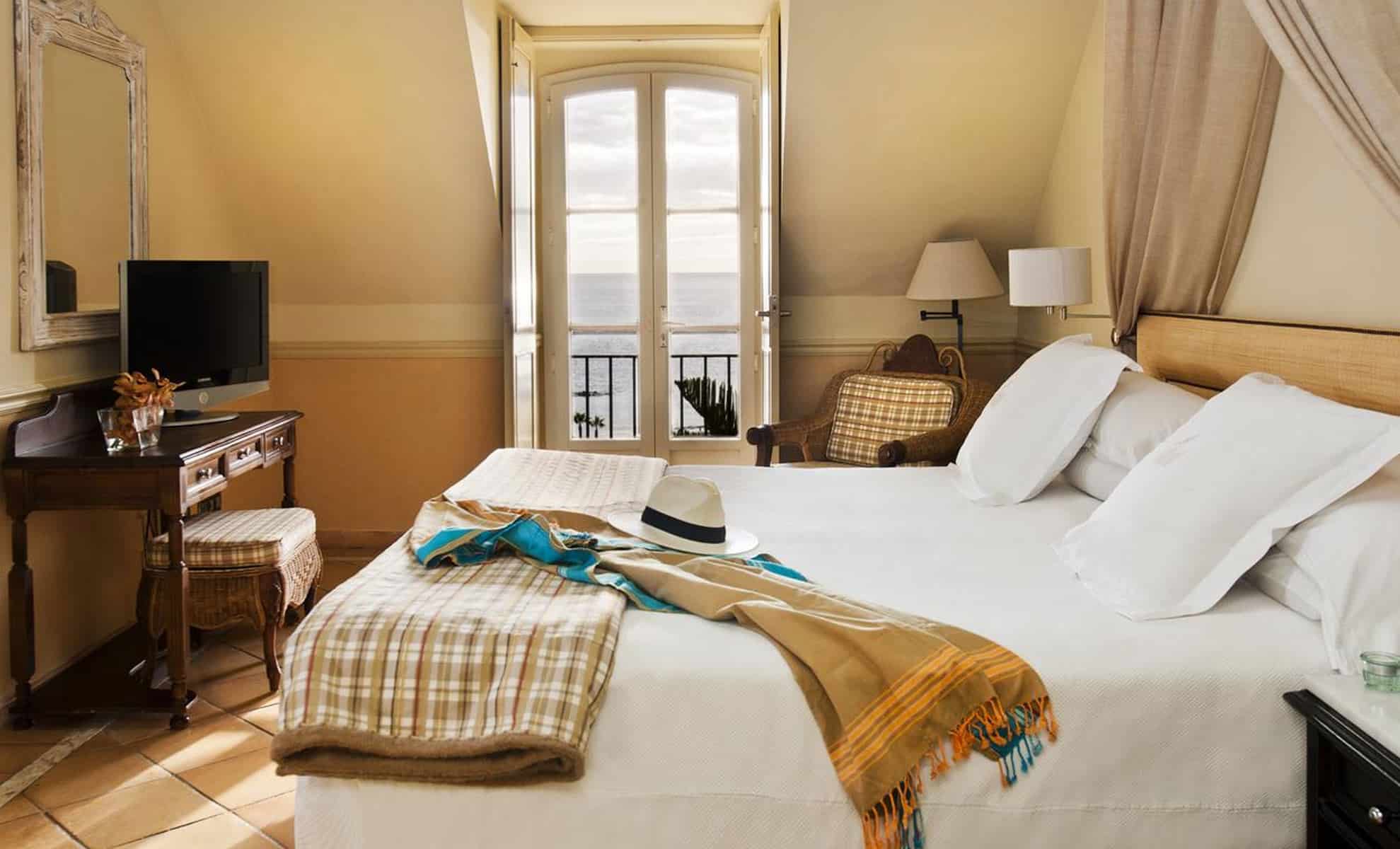 Nestled amongst tropical gardens on a hillside, the hotel is grand and luxurious, with a pretty, pastel-coloured exterior that is clearly influenced by Venetian splendour and colonial Canary Island style, and an interior that evokes Baroque and Moroccan design.