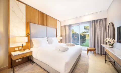 This room is 25-square-metres and is ideal for families. There is a double bed and space for an extra bed for a child, a bathroom and a balcony with a view over the driving range or garden. Amenities include: complimentary WiFi, air-conditioning, turndown service, minibar, cable TV, and bathrobe and slippers.