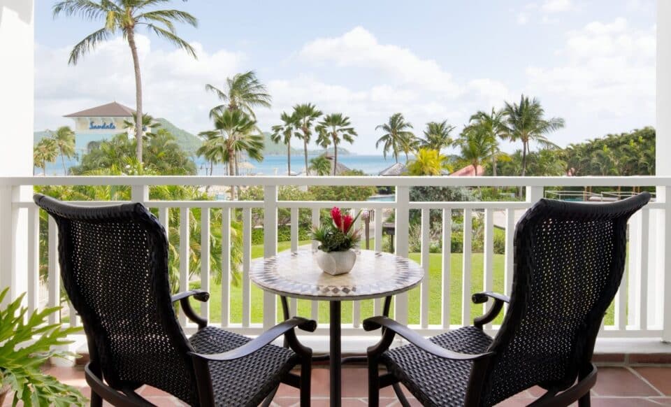 This room category overlooks the Atlantic Ocean, providing a view of the lights and mountains of the neighbouring island of Martinique. Located on the ground & second floor of the Bonne Terre and Pigeon Island, and the second and third floor Monchy Buildings. It features a king size mahogany bed, flat screen television, tiled floor, love seat and armchair. The bathroom either has a shower/ bathtub combination or a shower only. A balcony completes this luxury setting. For your refreshment, your room includes Robert Mondavi varietal wines and a refrigerator stocked with bottled water, juice, soda and local beer.
