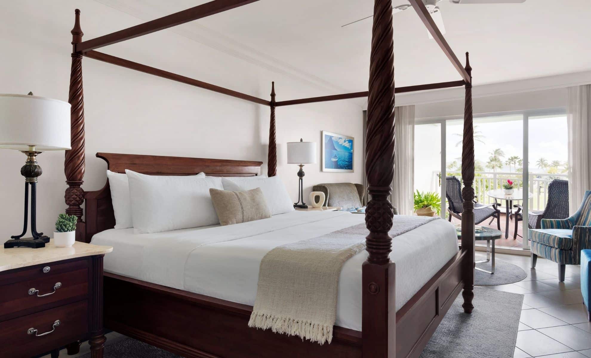 Located on the second level of the Cap Estate building, this cozy hideaway features a fully furnished private patio nestled among the resort’s lush gardens. The spacious interior features a four-poster, king-size bed, a cozy seating area, and a flat screen TV. The en-suite bath boasts either a shower/tub combination or shower only. For your refreshment, your room includes Robert Mondavi varietal wines and a refrigerator stocked with bottled water, juice, soda and local beer.